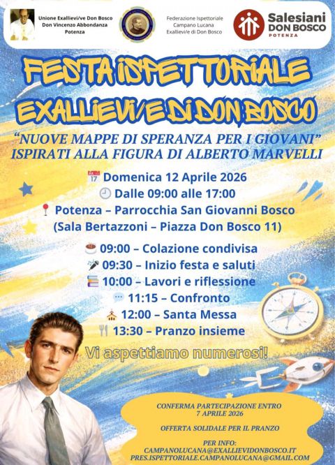 - sabato 20 aprile ore 10.30 a Salerno_Istituto: (per la Presidenza) Cons. Ispettoriale Exallievi per presentare il regolamento in vista delle Elezioni del nuovo Consiglio Ispettoriale che si terranno sempre a Salerno il 22 Giugno: saremo chiamati ad individuare a chi dei nostri vorremo chiedere la disponibilità ad assumersi impegno come Presidente e Consiglieri a livello Ispettoriale.
