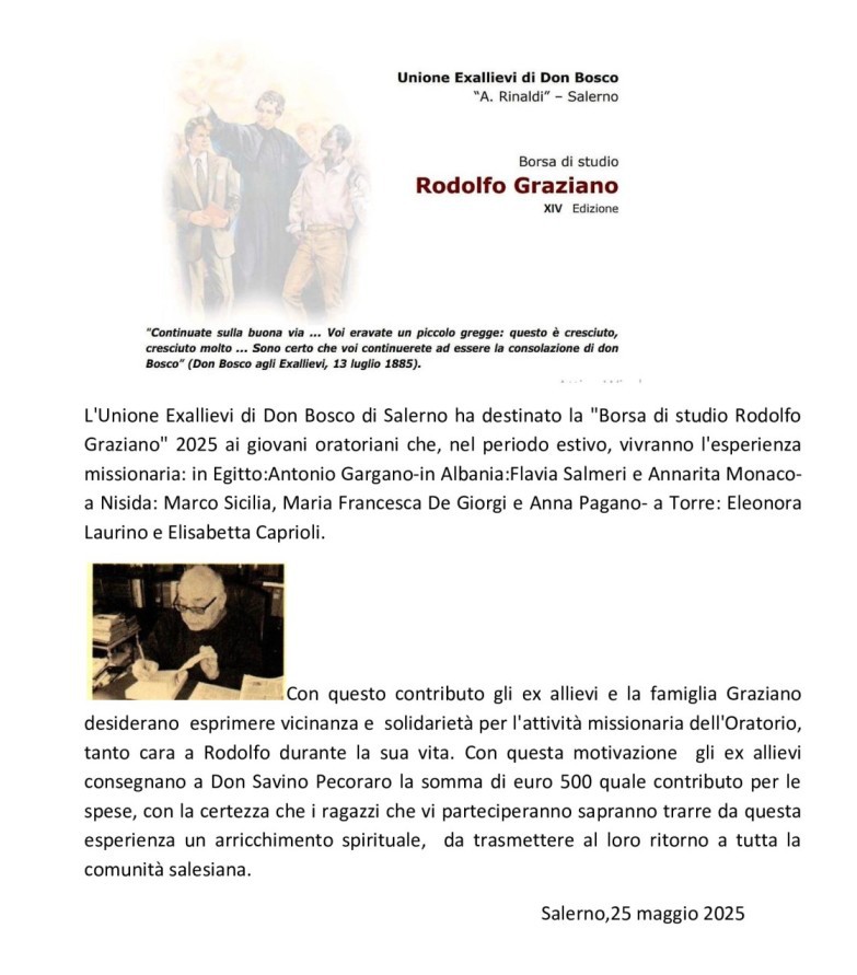 Grazie a te di aver scelto, rinnovando la tua iscrizione anche quest’anno,di far parte dell’Unione degli Exallievi/e di Don Bosco “A. Rinaldi” di Salerno.